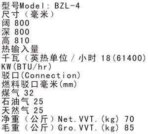 產(chǎn)品簡介:四頭煲仔爐參數(shù)型號:BZL-4長深高(mm):800 800 810風(fēng)機:E2熱輸入量(千瓦/小時):18KW煤氣:32石油氣:25天然氣:25凈重(公斤):70KG毛重(公斤):85KG